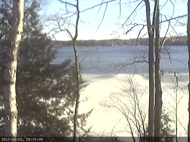 On a lighter note, the ice shelf hugging my shoreline this afternoon finally succumbed to wind and wave action, breaking up and floating away a little over an hour ago. And then just a bit ago a long thin slab of ice drifted in from some place and settled in against my shoreline. It has already broken up and floated away as I type. The only ice left is a bunch of slush that has washed up down at the far east end of the lake. From other reports I’ve gotten from others around the lake and what I’m seeing out side my window now, David Hodsdon will be hard pressed not to call ice out today, 03 April, 2013.